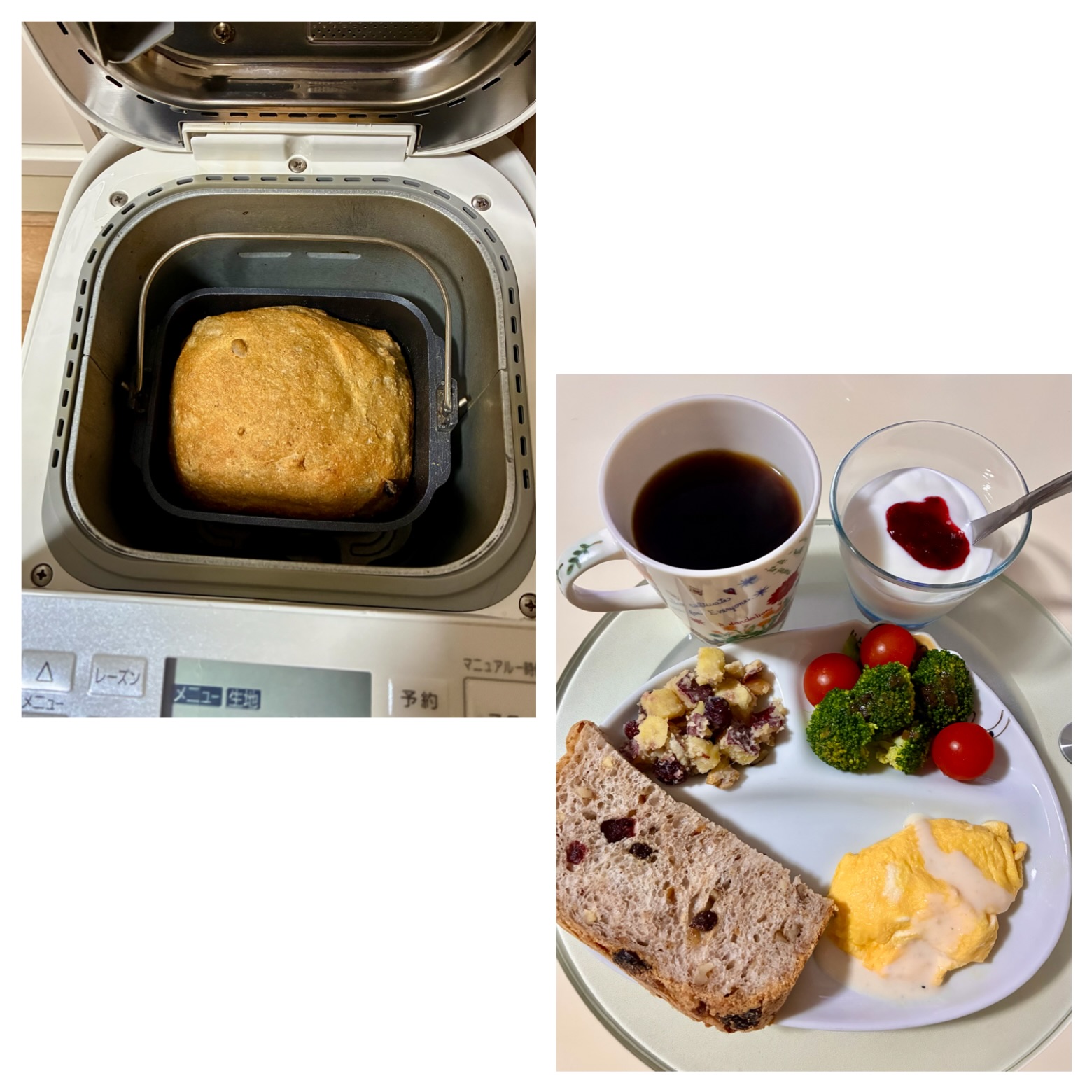 前日にセットしたパンが焼けました。明け方目が覚めてバターを入れてない事に気づきました😱時すでに遅し…焼き上げ前の発酵の作業だったのでそのまま焼き上がるのを待ちました。いつもより膨らみが悪いです😅耳の部分が硬く噛む回数も多かったです。顎鍛えられたかな…🤣